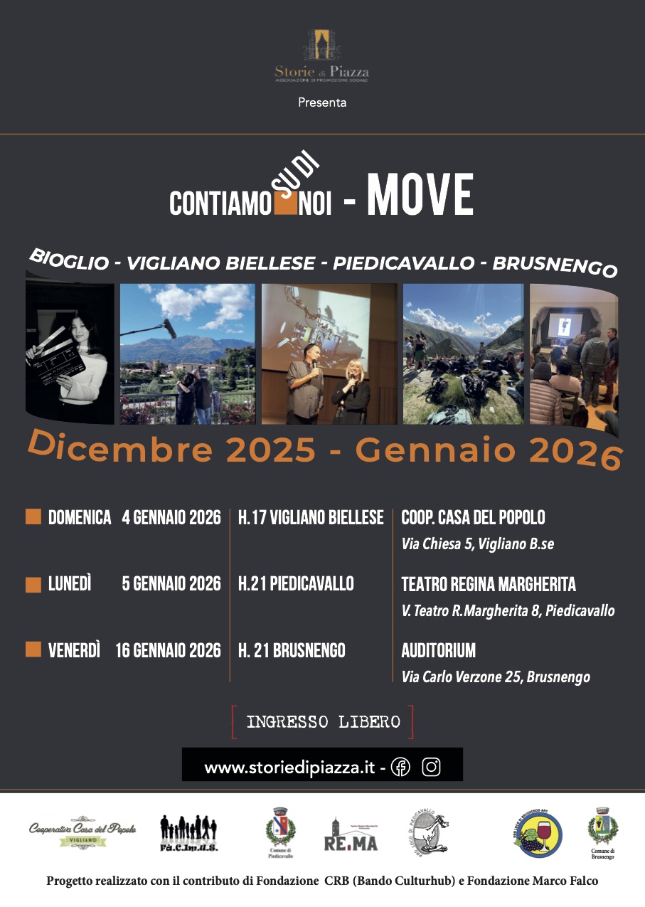 La rassegna di cinema dedicata ai giovani e al progetto Contiamo su di noi-Move che quest’anno ha realizzato 3 cortometraggi girati tra Biella (Cascina Oremo e Città Studi) e il Rifugio Rivetti, prosegue, dopo la presentazione del 29 novembre a Palazzo Gromo Losa e quella avvenuta a Bioglio il 7 dicembre, con altre 3 piazze biellesi: Vigliano Biellese, Piedicavallo e Brusnengo.